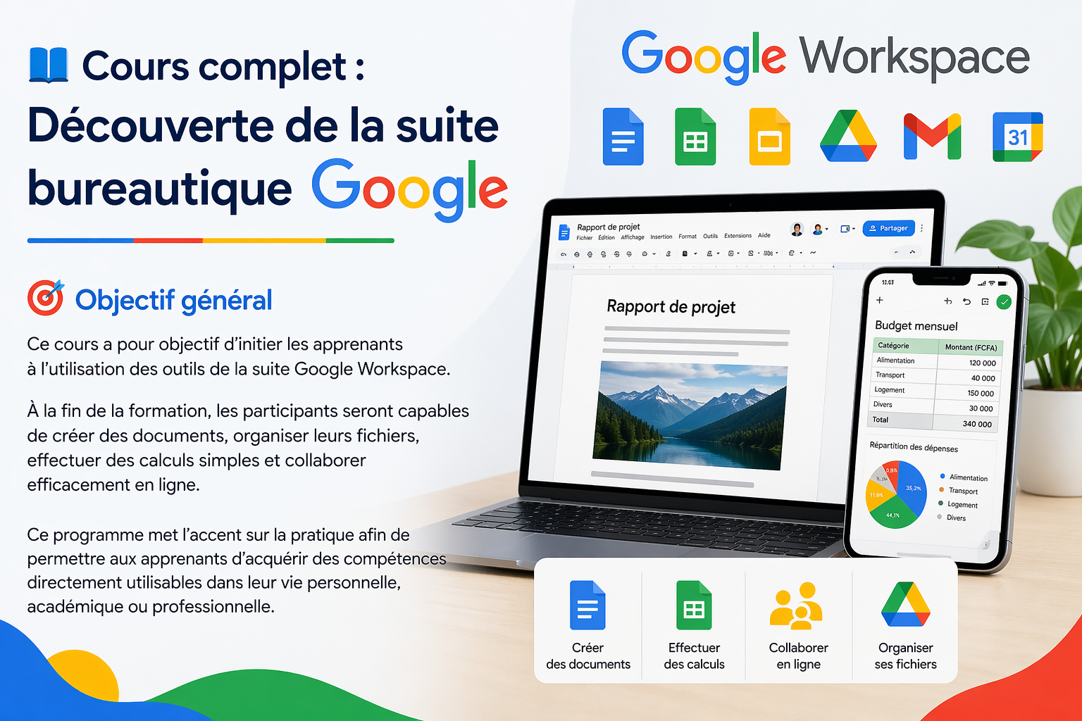 Ce cours a pour objectif d’initier les apprenants à l’utilisation des outils de la suite Google Workspace. À la fin de la formation, les participants seront capables de créer des documents, organiser leurs fichiers, effectuer des calculs simples et collaborer efficacement en ligne.